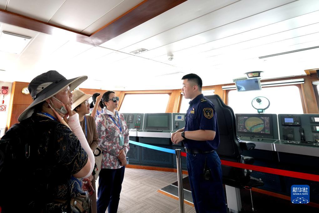7月11日,在上海港國際客運中心碼頭,海事巡航救助船“海巡01”輪船員向公眾介紹船舶知識。