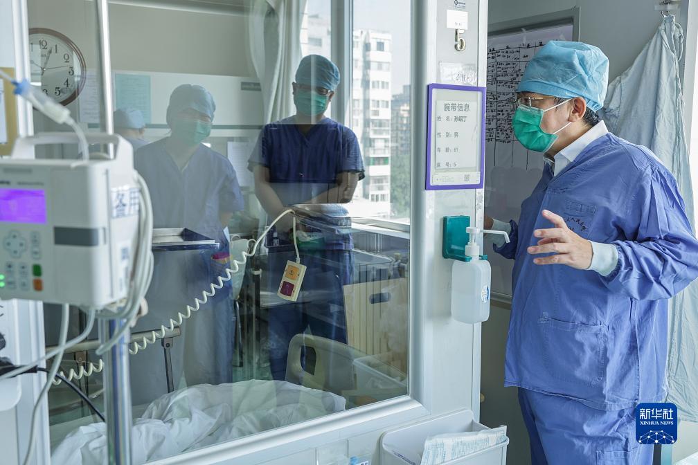 6月30日,黃曉軍在北京大學人民醫院血液科骨髓移植倉裏查房。