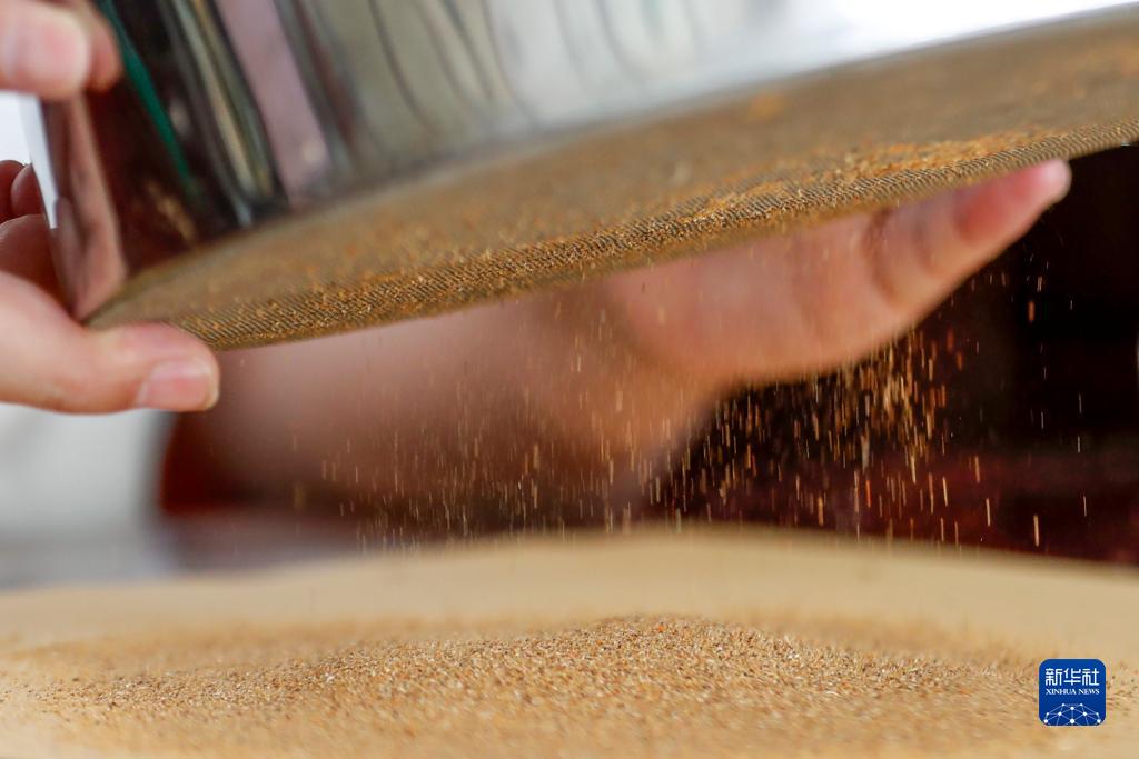 7月11日,在安徽省黃山市屯溪區,非遺新安醫學代表性傳承人程劍峰在篩藥,準備製作“三伏貼”。