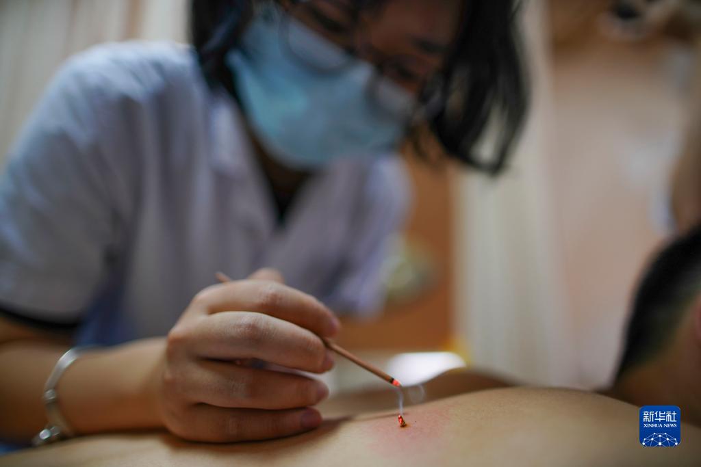7月11日,在浙江省溫州市中心醫院,醫護人員在為市民進行“麥粒灸”。