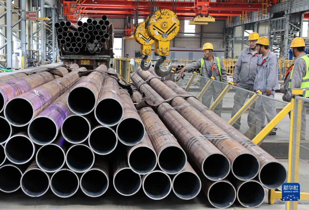 7月11日,在承德市鷹手營子礦區一家無縫鋼管生産企業,工作人員在進行裝車前準備工作。