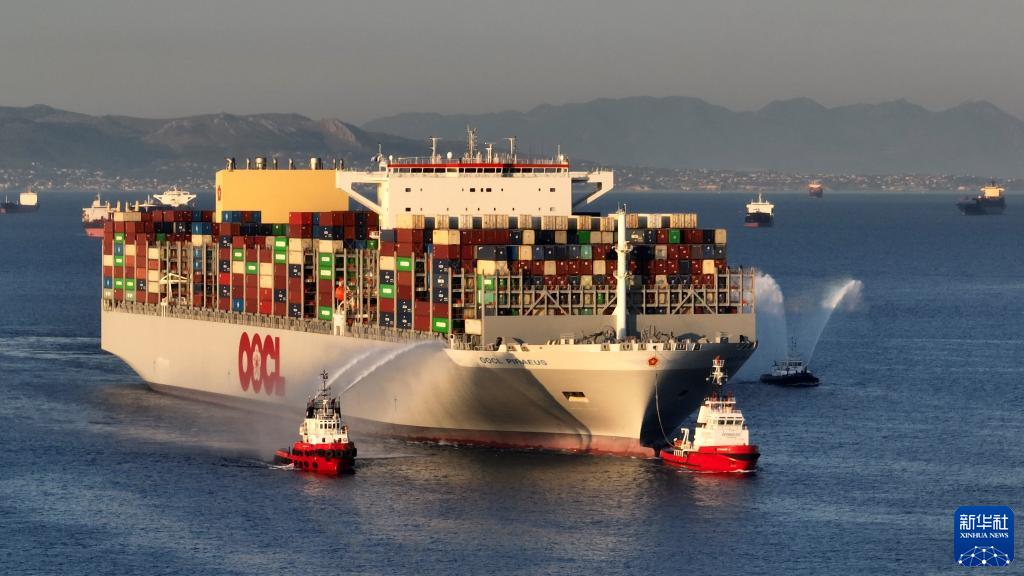“東方比雷埃夫斯”號大型集裝箱船10日抵達希臘最大港口比雷埃夫斯。港方以“水門禮”歡迎這艘近400米長的集裝箱船首航挂靠比港。“東方比雷埃夫斯”號長399.9米,寬61.3米,可裝載24188個標準集裝箱,是世界上最大的集裝箱船之一。