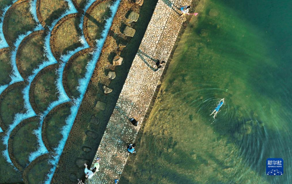 7月11日,人們在杭州臨安高虹鎮的龍鱗壩戲水(無人機照片)。