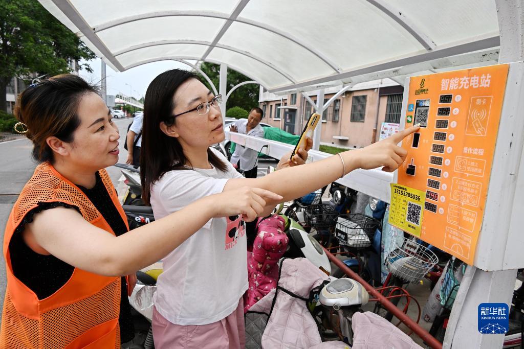 7月11日,在青島膠州市九龍街道一電動自行車集中充電點,社區工作人員指導車主掃碼充電。