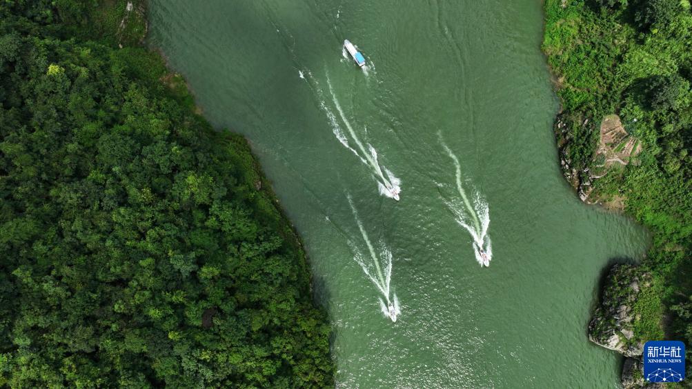7月11日,游客在貴州省遵義市播州區楠木渡景區乘快艇游覽(無人機照片)。