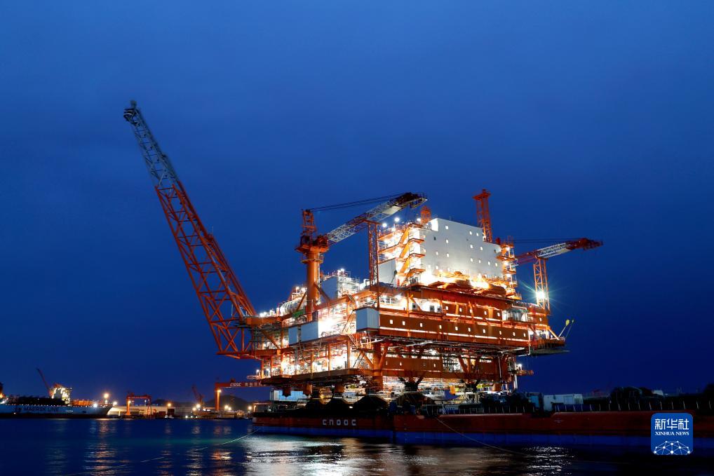 7月10日,渤中19-6凝析氣田一期項目中心平台在青島成功裝船,即將奔赴渤海西部海域,進入海上安裝和聯調階段。新華社發(杜鵬輝 攝)