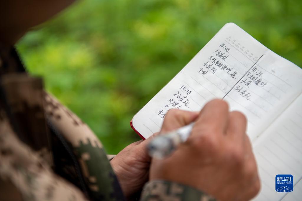 7月8日,在高黎貢山國家級自然保護區,一名巡護隊員記錄觀察到的猴群活動信息。新華社記者 徐嘉懿 攝