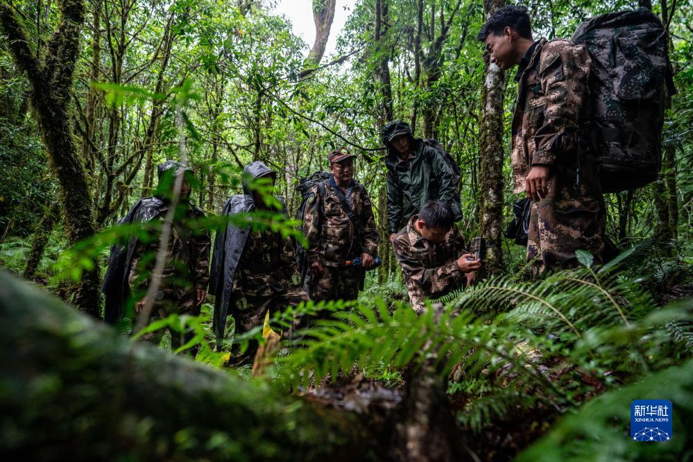7月9日,巡護隊員在高黎貢山國家級自然保護區安放紅外相機。新華社記者 江文耀 攝