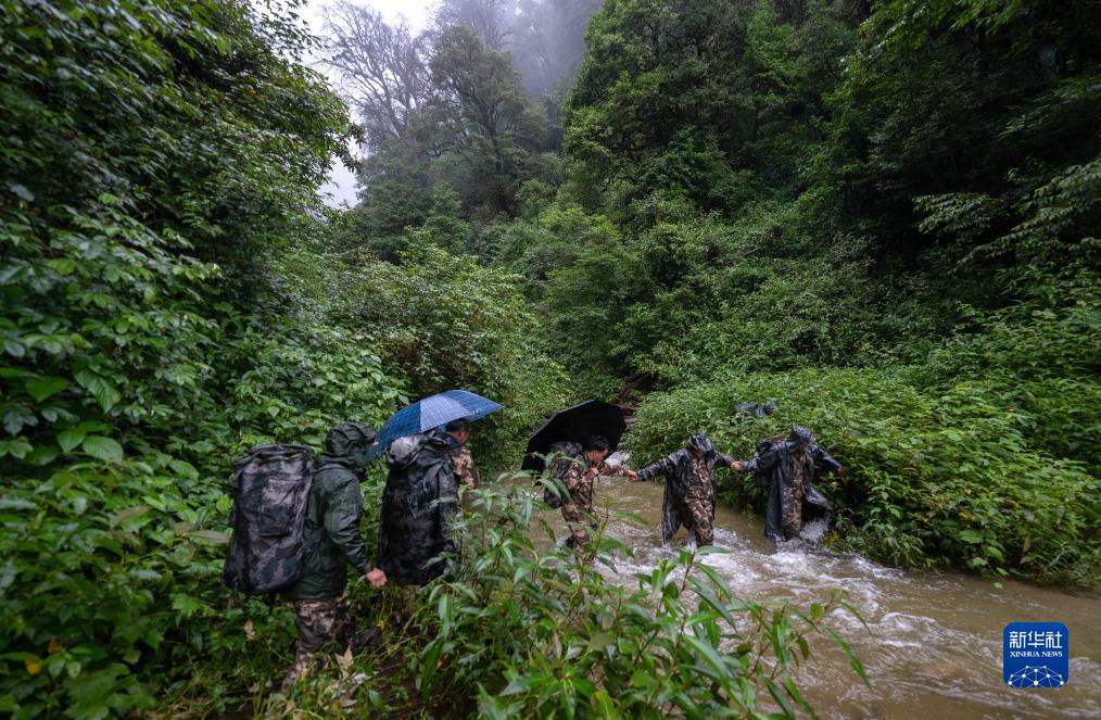 7月9日,在高黎貢山國家級自然保護區,巡護隊員相互幫助蹚過湍急的溪流。新華社記者 費茂華 攝
