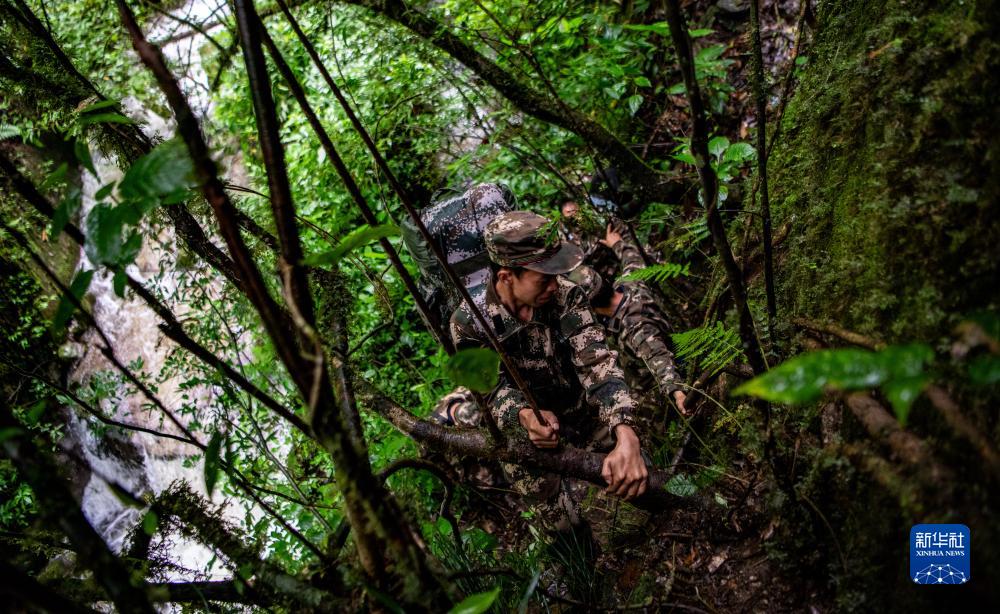 7月8日,在高黎貢山國家自然保護區,巡護隊員抓着樹根順着接近90度的懸崖慢慢滑下。新華社記者 江文耀 攝