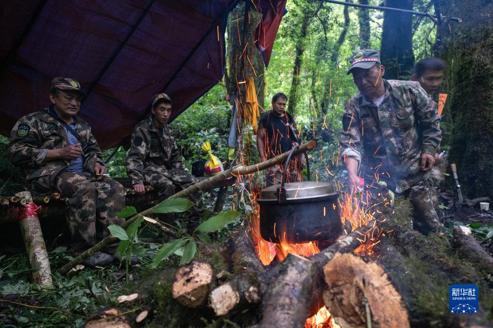7月8日,在高黎貢山國家自然保護區,巡護隊員圍在篝火旁做飯並烤乾濕衣服。新華社記者 費茂華 攝