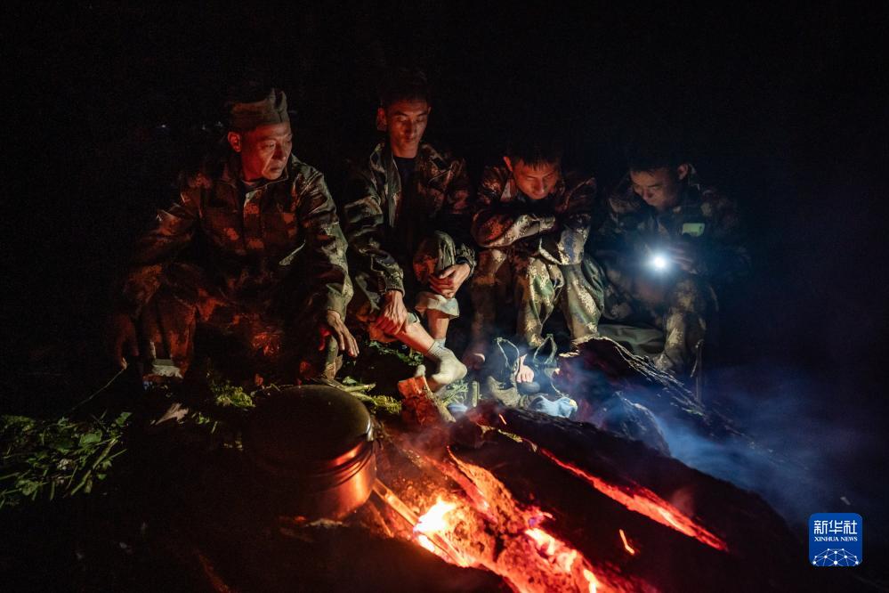 7月8日,在高黎貢山國家自然保護區,巡護隊員們在篝火旁烘乾鞋襪。新華社記者 江文耀 攝