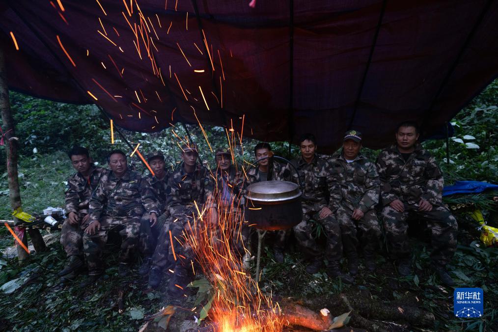 7月8日,在高黎貢山國家自然保護區,巡護隊員李加華、何貴品、勒利付、阿華利、張全、周國偉、普三材、歐學軍、施建雄(從左至右)坐在篝火旁合影。新華社記者 費茂華 攝