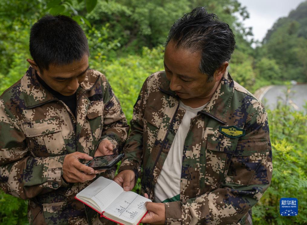7月8日,何貴品(右)在查看護林員喬新華記錄的菲氏葉猴的行動軌跡。新華社記者 費茂華 攝