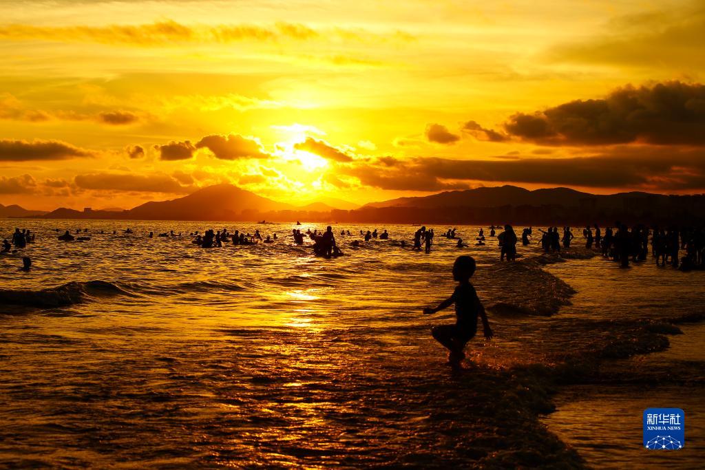 7月11日,家長帶着孩子在海南省三亞市三亞灣戲水消暑。