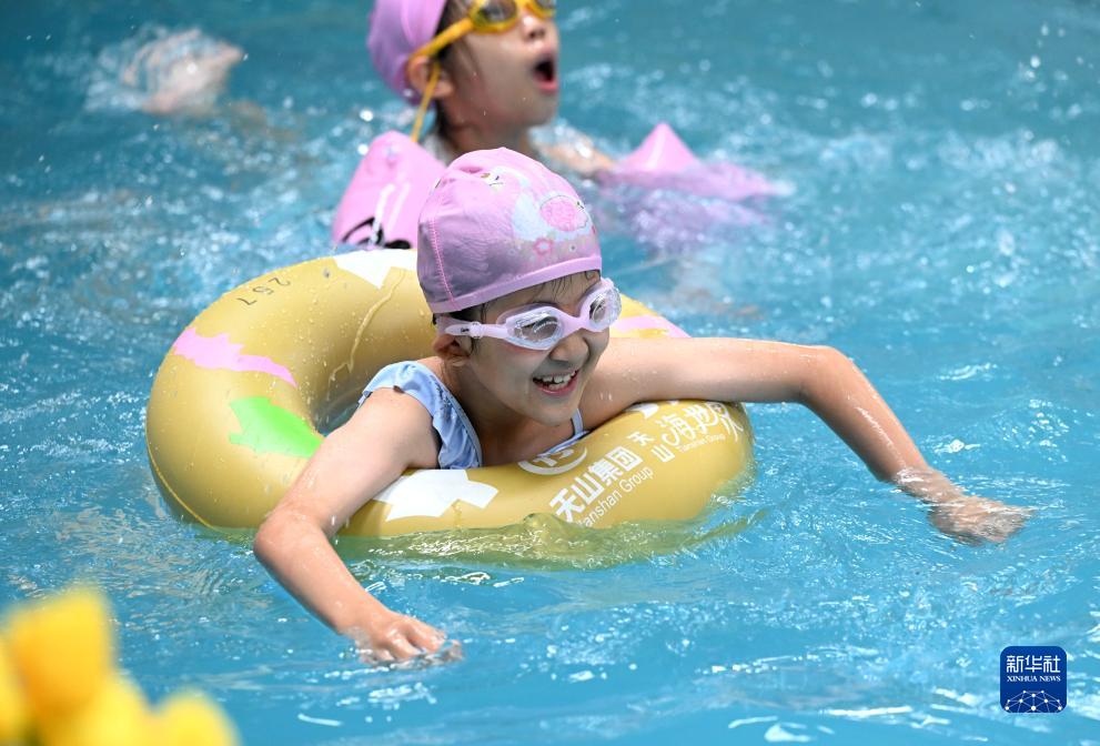 7月11日,小朋友在河北省石家莊市高新區一家戲水樂園游泳。