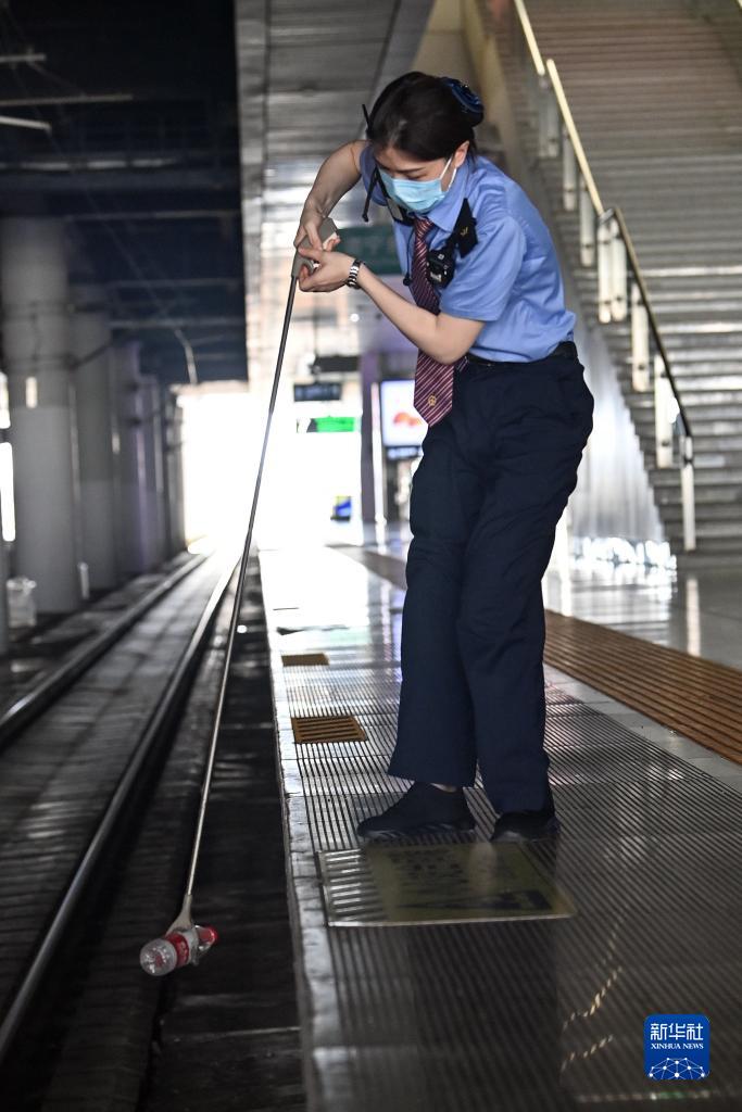 在南寧東站,客運員唐瑩利用接送車間隙時間清理軌道上的雜物(7月11日攝)。
