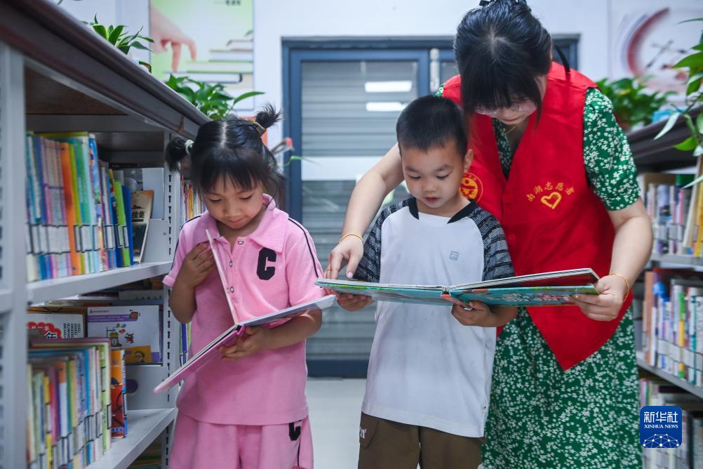 7月12日,在當日開班的烏橋村暑期夏令營裏,孩子們在志願者的陪伴下讀書。為解決外來務工人員子女暑期“看護難”問題,嘉興市南湖區新豐鎮社工站聯合烏橋村開展“候鳥歸巢,歡樂一‘夏’”暑期夏令營,外地來此過暑假的小候鳥們可以在這裡學習科普知識,接受暑期安全教育,參加繪畫、手工興趣課等。