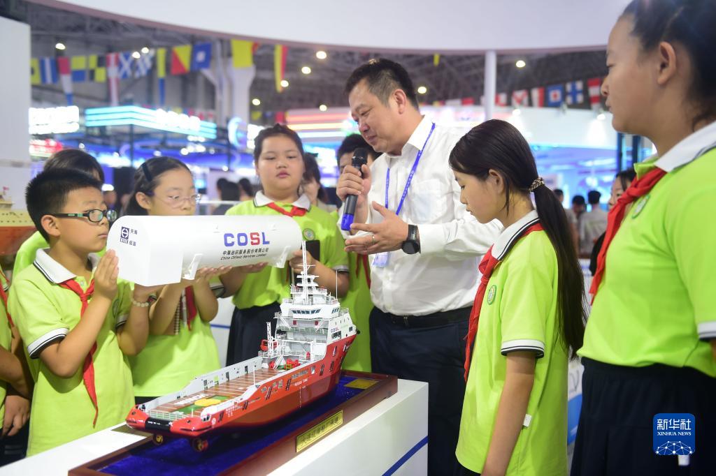 7月12日,小學生在航海科技博覽會上參觀LNG清潔能源動力的船舶模型。