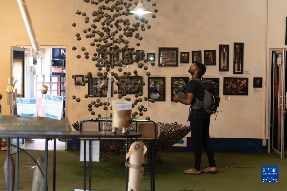 7月11日,一名男子在老撾首都萬象“義肢與矯形合作事業”展館裏觀看模擬美軍散佈集束彈藥的展品。