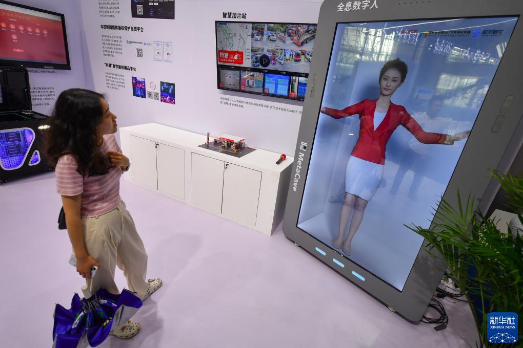 7月12日,參觀者在中國新媒體技術展上參觀全息數字人。