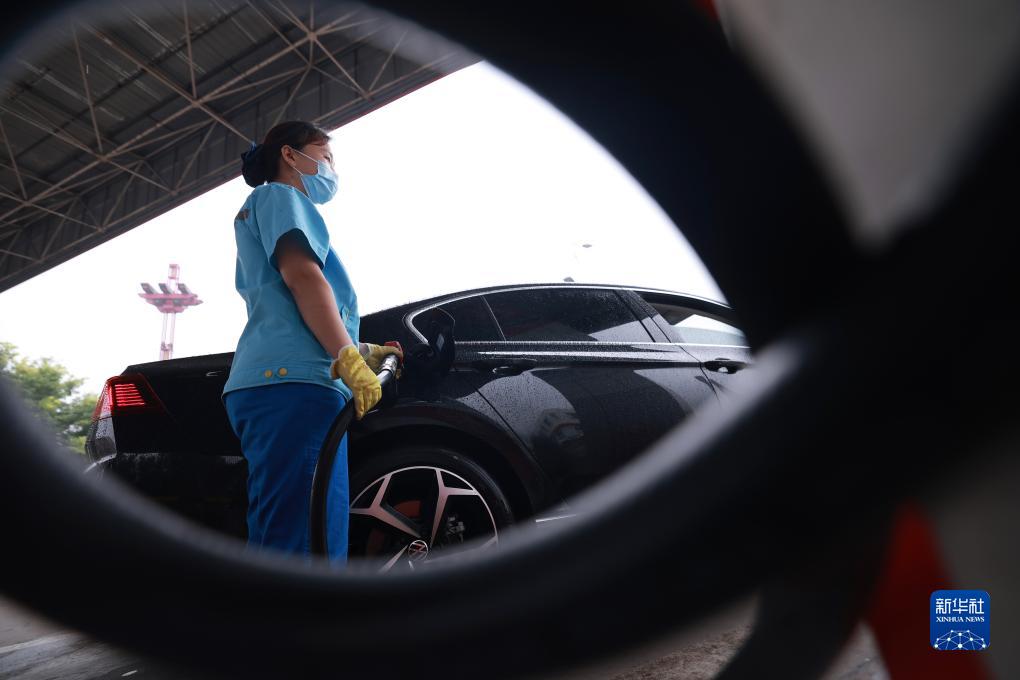 7月12日,河北省內丘縣一家加油站的工作人員為汽車加油。