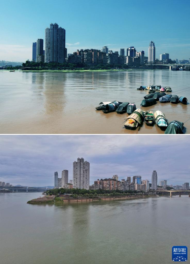 拼版照片:上圖為2012年7月,在瀘州館驛嘴沱江匯入長江處,多艘漁船在此停靠(曹衛兵攝);下圖為2023年6月1日拍攝的瀘州館驛嘴風光(新華社記者劉坤攝)。2019年,瀘州全面啟動長江流域重點水域漁民退捕工作,漁船上岸集中處置,漁民上岸分類安置。