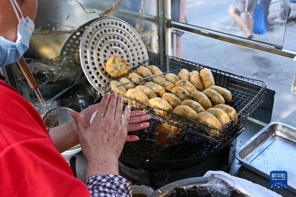 7月10日,在天津市紅橋區西關大街一家早點鋪,商家在製作炸糕。