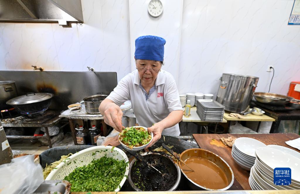 7月11日,在天津西北角一家早點鋪,商家在調配鍋巴菜配料。
