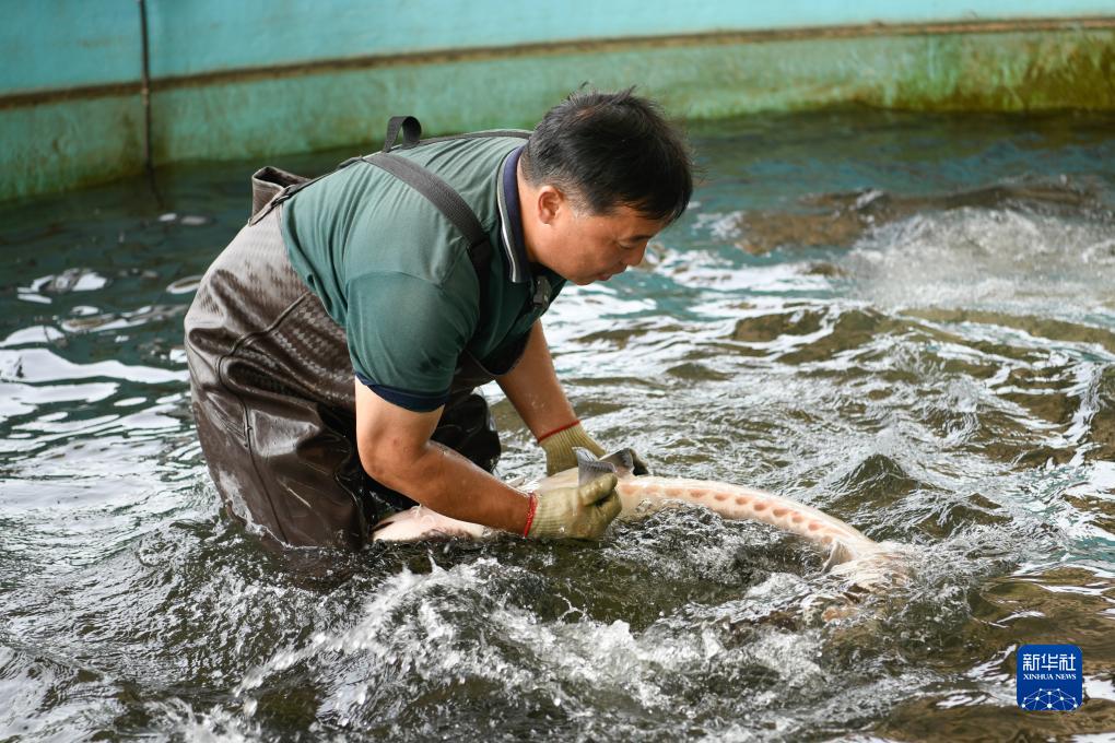 2023年6月27日,在宜賓珍稀水生動物研究所與四川省農科院水産研究所合作的繁育基地,周亮檢查不久前進行人工繁殖的長江鱘身體恢復情況。新華社記者 胥冰潔 攝