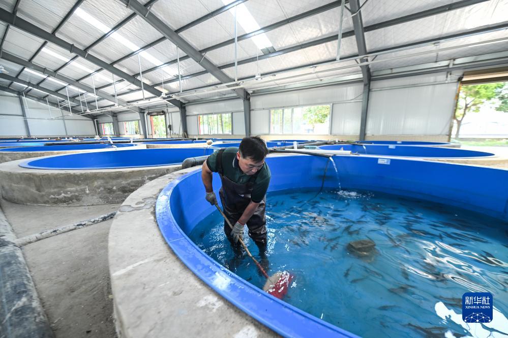 2023年6月27日,在宜賓珍稀水生動物研究所與四川省農科院水産研究所合作的繁育基地,周亮在清理長江鱘幼魚池。新華社記者 王曦 攝