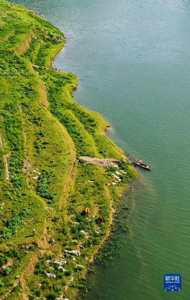 7月10日,盧錫永、冉茂英夫婦駕駛小船在烏江上打撈漂浮物(無人機照片)。