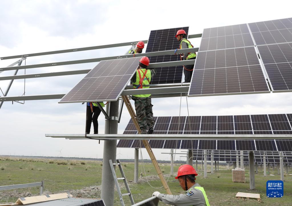 7月11日,在張家口市康保縣張紀鎮,工人在一處光伏發電場建設工地施工。