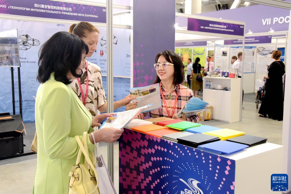 7月11日,在俄羅斯葉卡捷琳堡舉辦的第七屆中俄博覽會上,參觀者與中方參展代表交談。