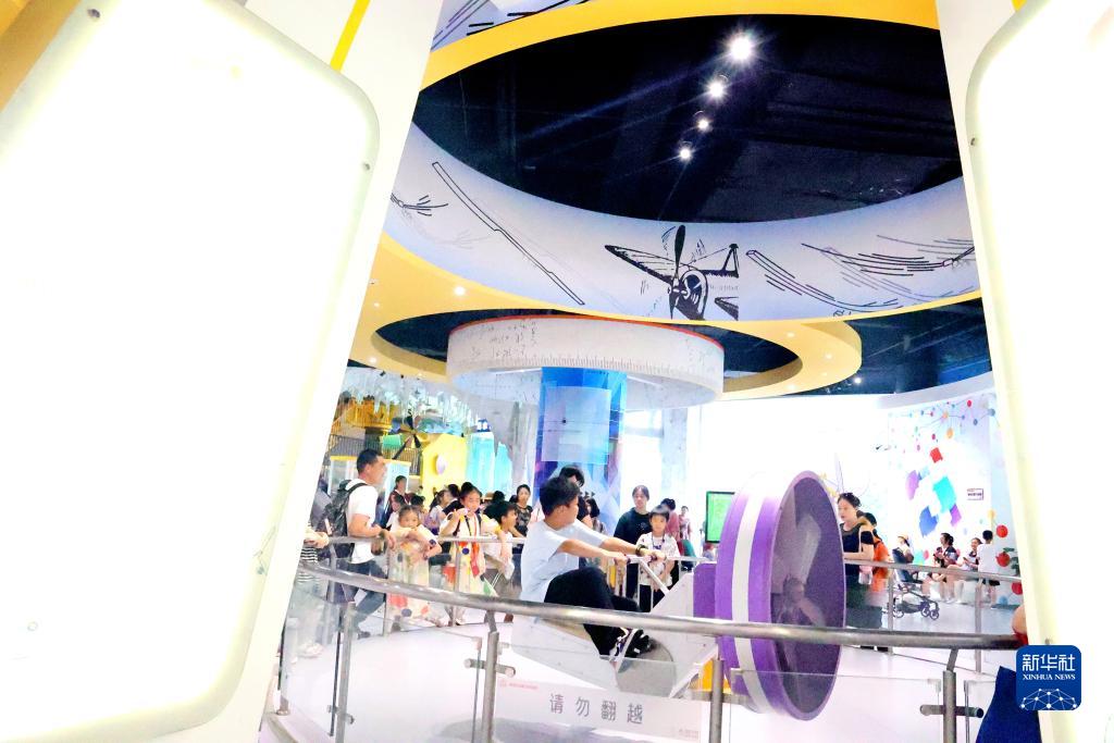7月12日,小朋友在浙江省科技館裏參觀體驗。