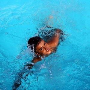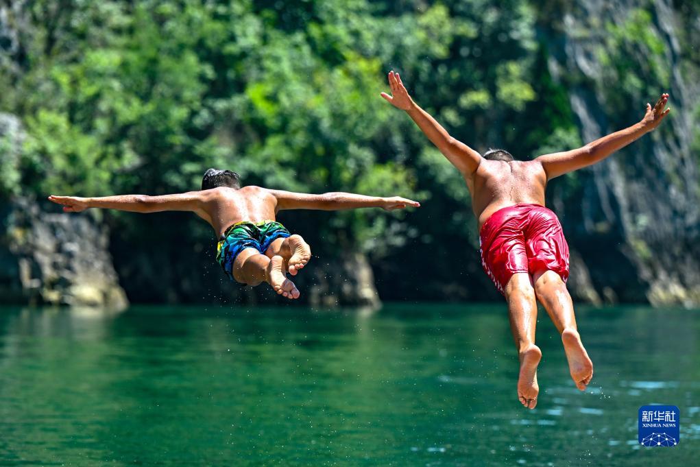 7月12日,在北馬其頓斯科普裏附近的特雷斯卡河,人們跳水納涼。