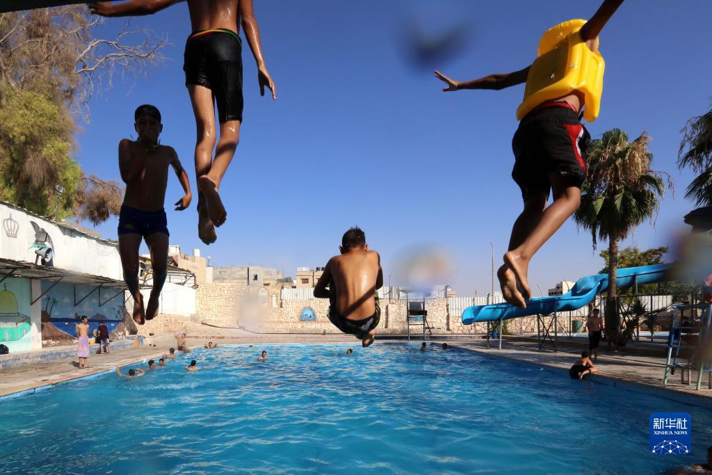 7月12日,在約旦扎爾卡,人們躍入泳池。