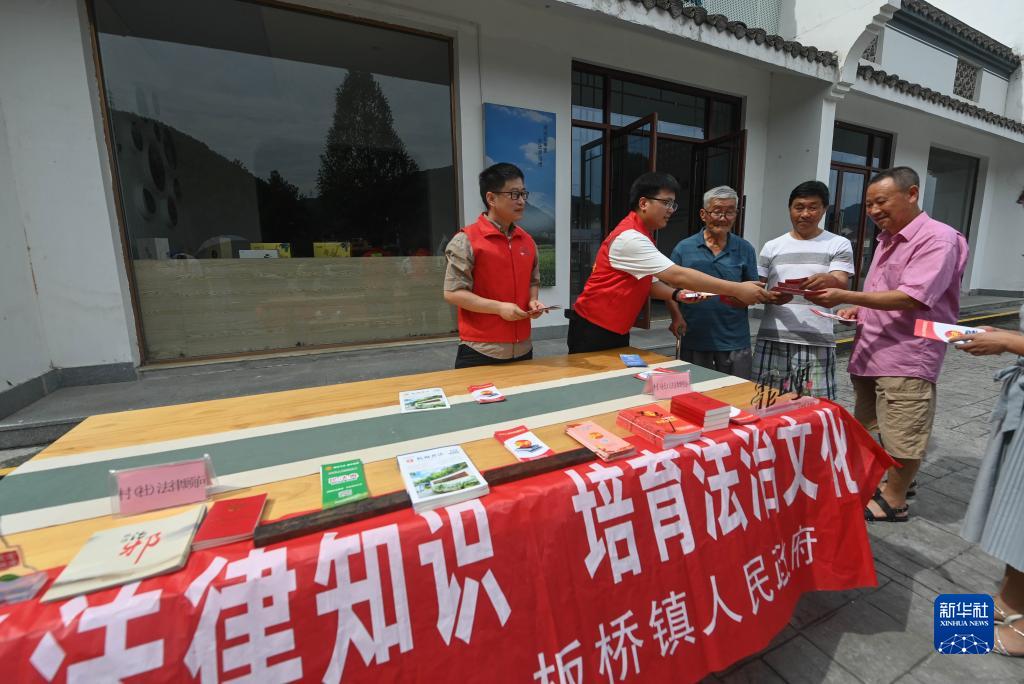 7月13日,在杭州市臨安區板橋鎮上田村文化禮堂前,板橋鎮聯合共建單位舉行“法律服務到村口”活動,黨員志願者發放宣傳手冊並解答群眾的法律問題。