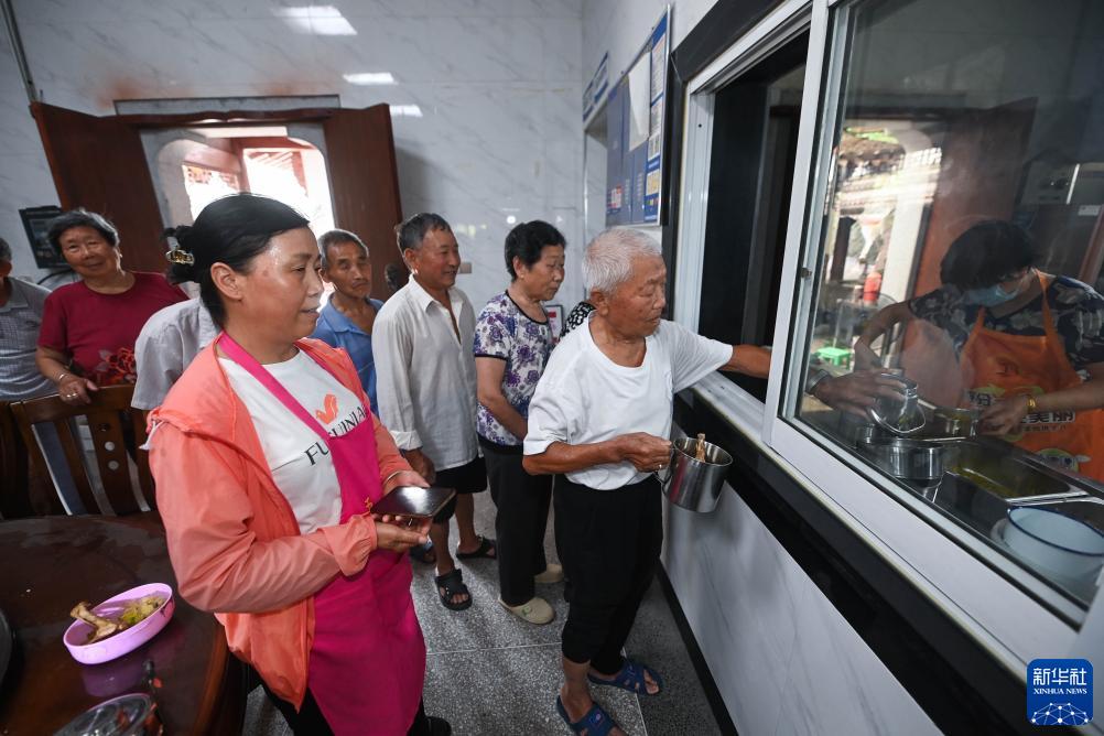 7月13日,老人們在湍口鎮迎豐村老年食堂打飯。這個老年食堂的建設得益於新鄉賢們的捐贈相助。
