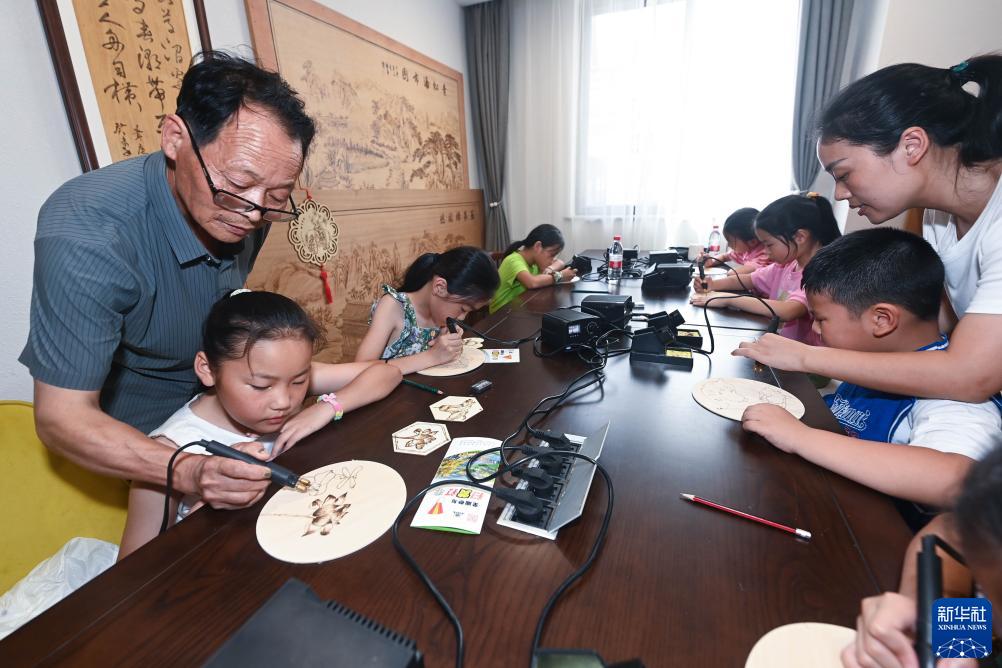 7月13日,在杭州市臨安區湍口鎮黨群服務中心,新鄉賢、湍口燙畫技藝代表性傳承人葉福來(左一)在指導孩子們學習燙畫。