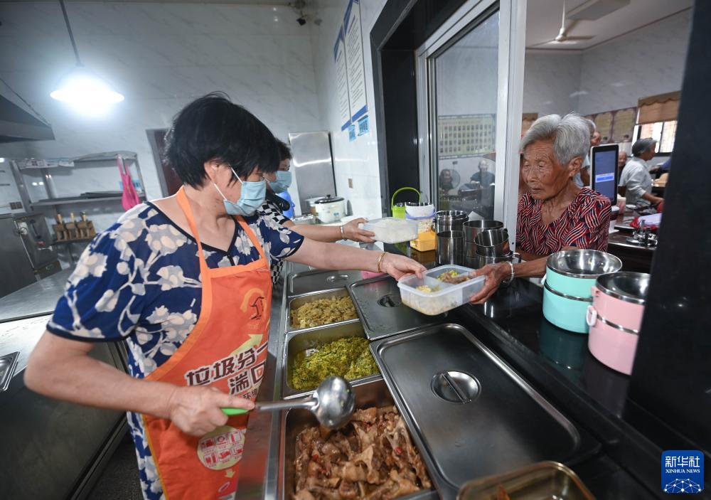 7月13日,老人們在湍口鎮迎豐村老年食堂打飯。該老年食堂的建設得益於新鄉賢們的捐贈相助。
