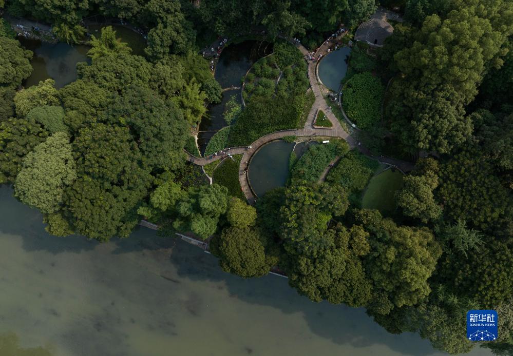 這是俯瞰活水公園的人工濕地塘床生態系統(6月23日攝,無人機照片)。位於成都市府河邊的活水公園,集水環境、水凈化、水教育於一體,有雨水自然處理系統、生態河堤系統、活水公園峨眉山植物生態群落共同構成典型的“山水林田湖”生命共同體的海綿城市系統。新華社記者 江宏景攝