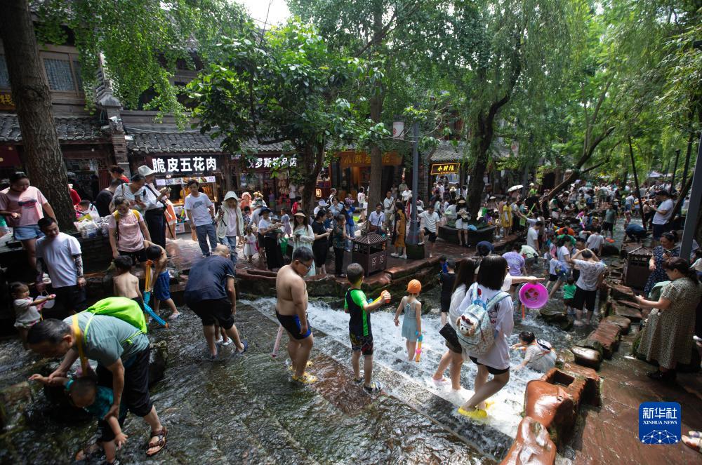 黃龍溪古鎮的水景觀成為孩子們親水避暑的樂園(6月24日攝)。作為國家4A級旅游景區,黃龍溪古鎮臨水而興,黃龍溪親水是不少成都市民在節假日青睞的游玩方式。2016年,黃龍溪斷面水質是劣Ⅴ類,如今,已經達到了Ⅲ類。新華社記者 江宏景攝