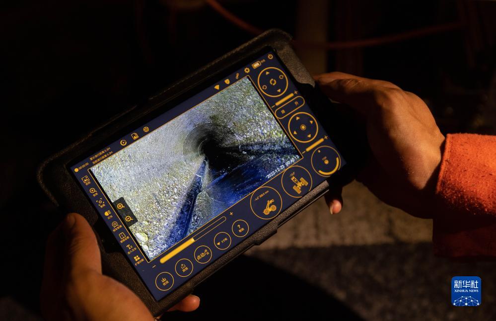 在成都市高新區天府二街,工作人員正操控一台管道檢測機器人在排水管道裏工作(6月16日攝)。新華社記者 江宏景攝