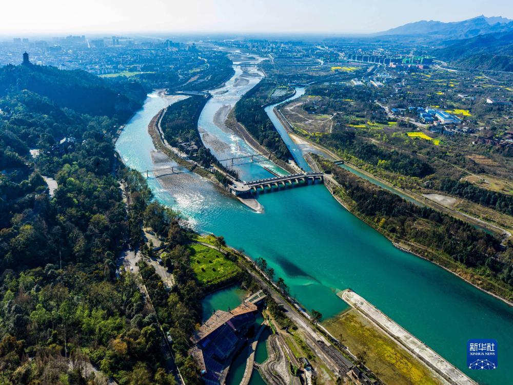 俯瞰都江堰水利工程,錦江起于都江堰(2023年3月4日攝)。新華社發(王琦攝)