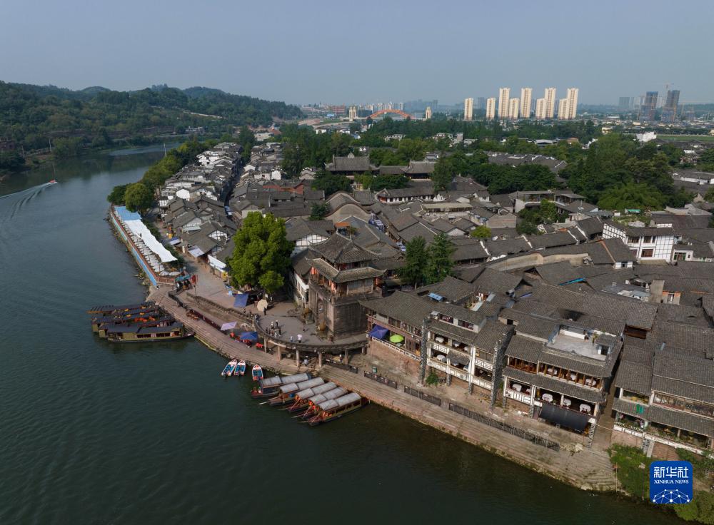 俯瞰黃龍溪古鎮碼頭(6月24日攝,無人機照片)。黃龍溪古鎮是錦江流出成都的出境地,作為國家4A級旅游景區,黃龍溪古鎮臨水而興,黃龍溪親水是不少成都市民在節假日青睞的游玩方式。2016年,黃龍溪斷面水質是劣Ⅴ類,如今,已經達到了Ⅲ類。新華社記者 江宏景攝