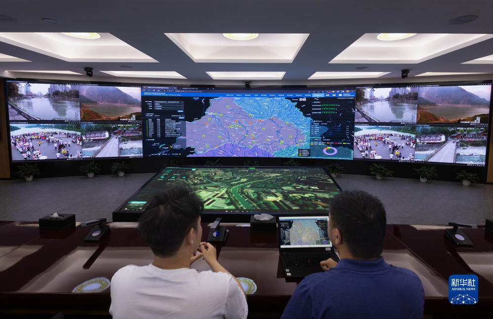 工作人員在監控成都市河長制管理信息系統(6月14日攝)。新華社記者 江宏景攝