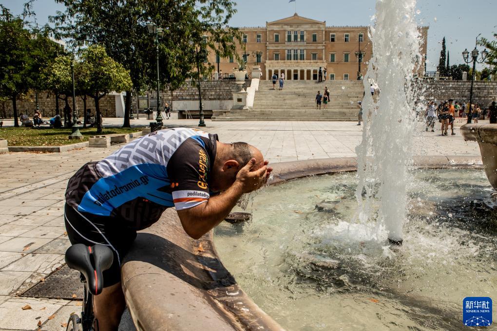 7月12日,在希臘首都雅典,男子在噴泉處洗臉納涼。
