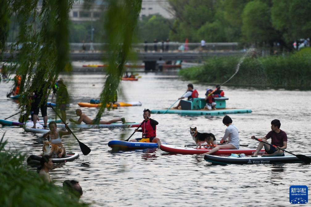 這是人們在北京亮馬河上划槳板(6月23日攝)。