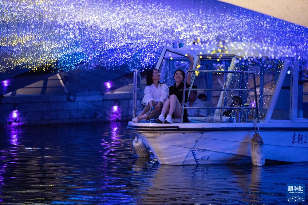 這是人們乘坐北京亮馬河遊船經過被裝點成“星空”的好運橋(6月16日攝)。